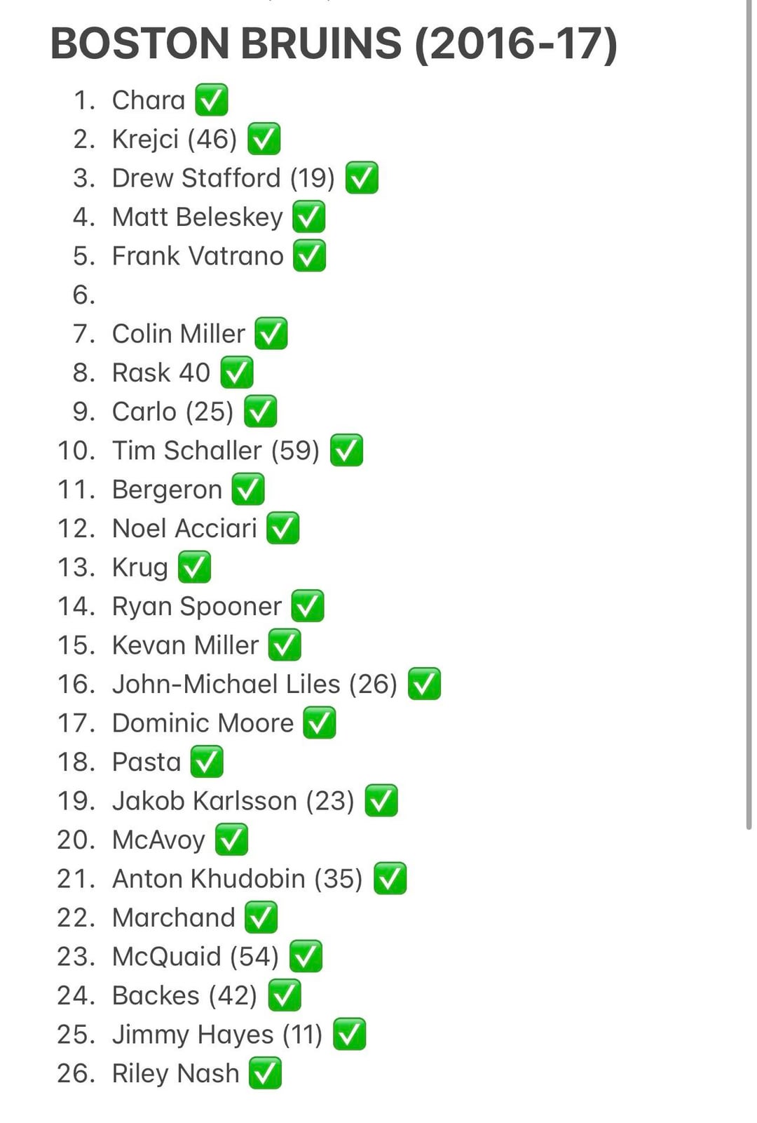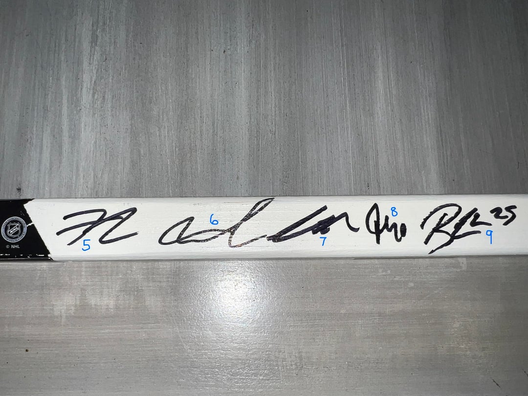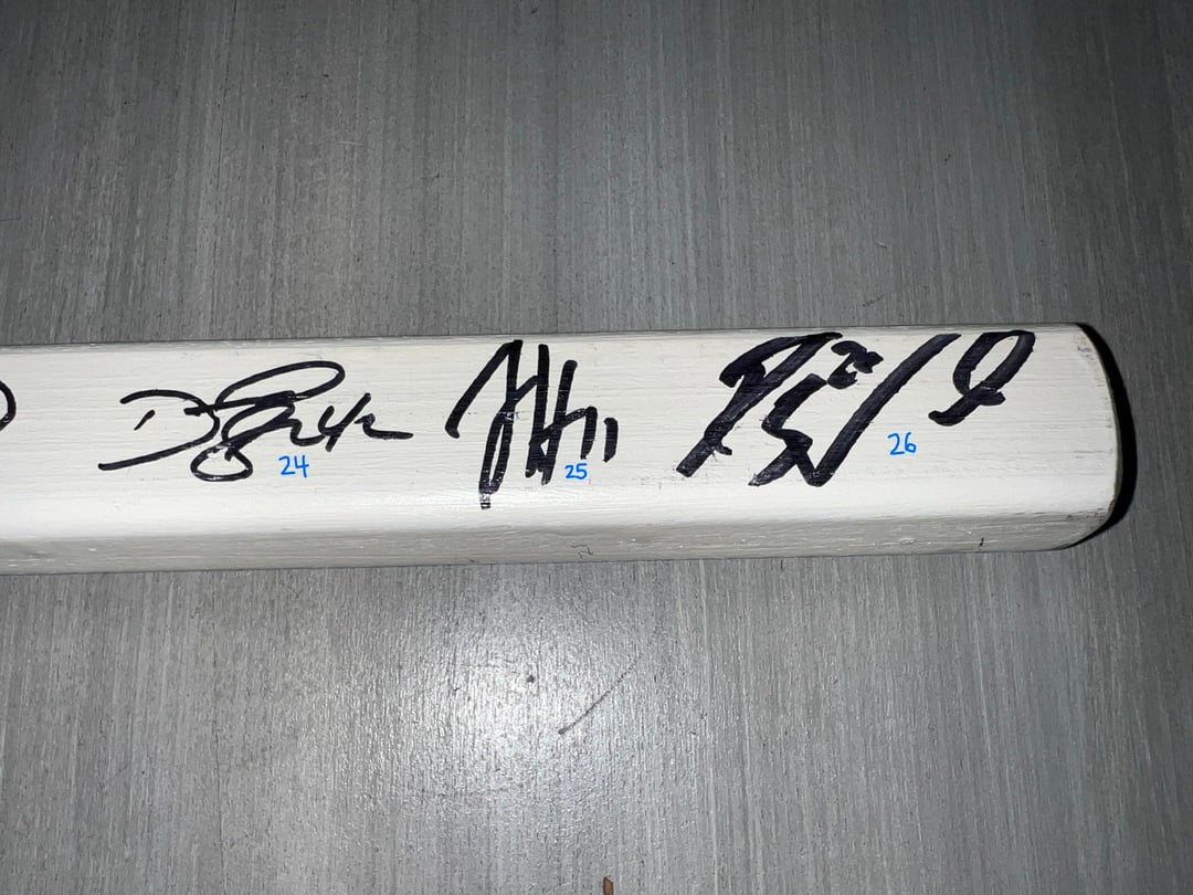 J’ai reçu ce bâton signé de mon père… j’ai pu le limiter à l’équipe 2016-17. J’en ai la plupart confirmés, mais il manque toujours le n°6 (voir photos). Je ne suis pas non plus sûr de quelques autographes (McAvoy, Marchand, Rask, etc). Remarque : certaines de ces signatures sont si mauvaises que c’est plutôt drôle. Merci.