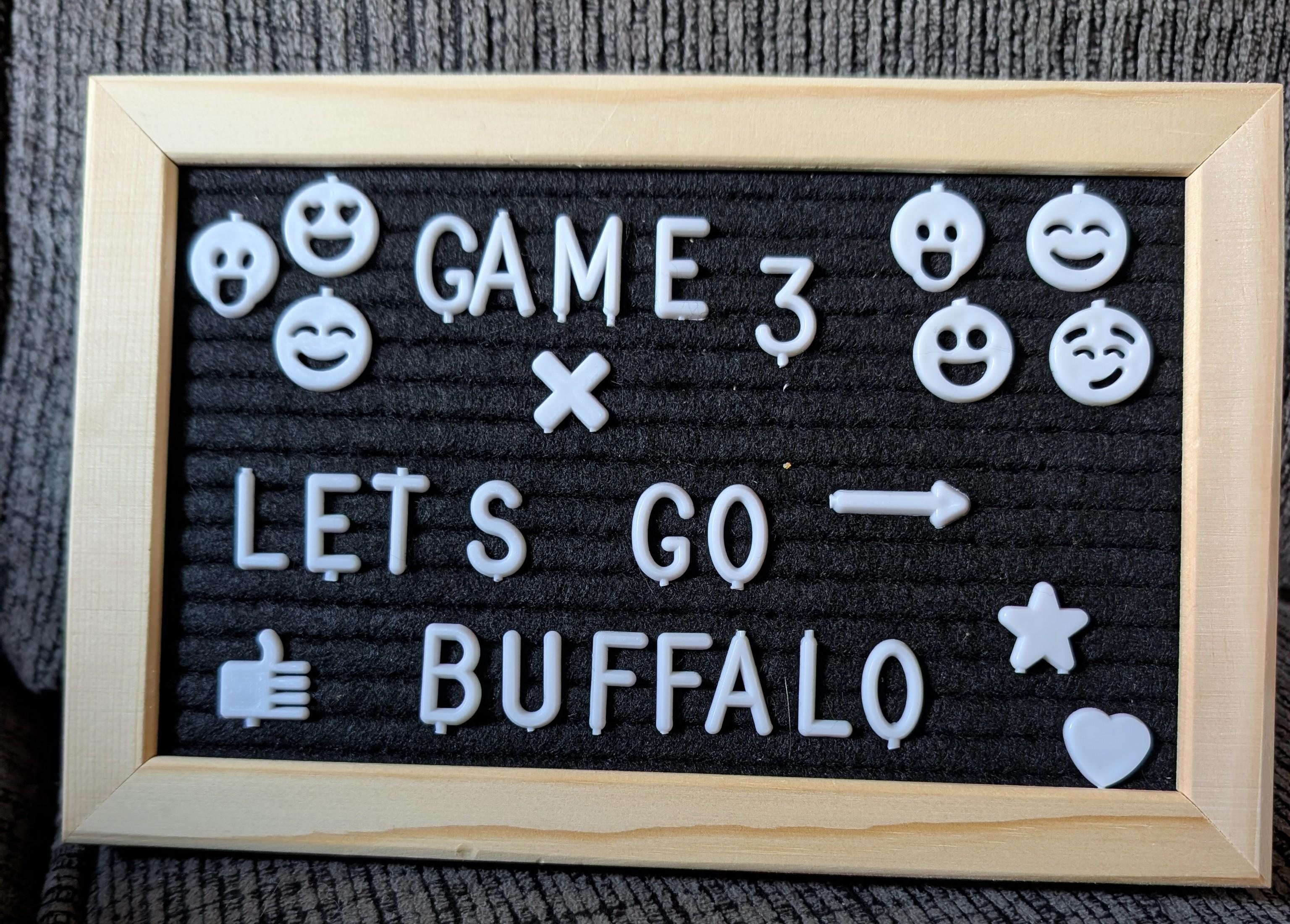 C’est déjà très gentil de leur part de jouer pour moi le jour de mon anniversaire : une victoire serait la cerise sur le gâteau ! Mon fils m’a aidé à décorer l’enseigne, il préfère les visages 🥰 Allons-y Buffalo !