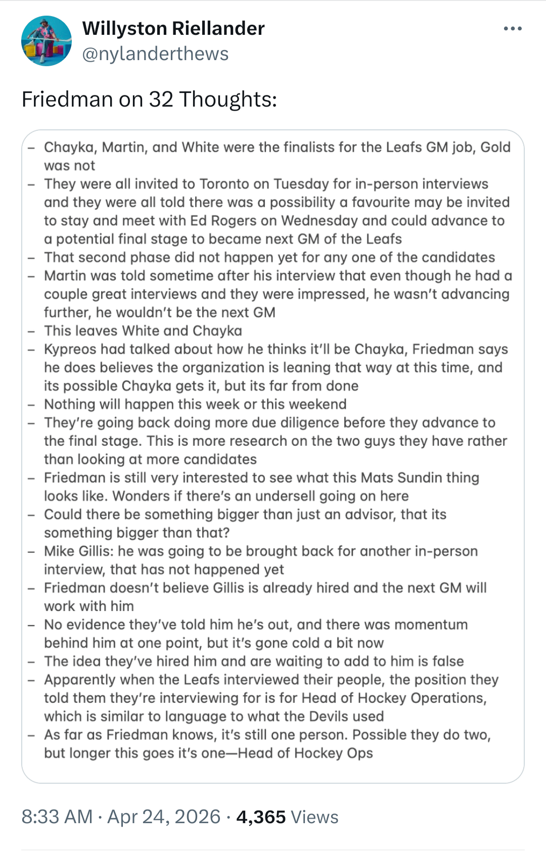 I had been hoping for something like Gillis as President, Gold or White as GM, and Sundin in there as a special advisor or something. The Gillis rumours were so strong, I hadn’t given Chayka much thought. If he’s hired, will really need to hear what he has to say, who else is involved, etc.