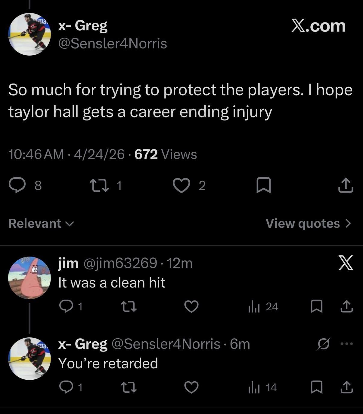 ~ The Sens fan is an emotional idiot who said something dumb because hes frustrated about how the series has gone. I’ve been there too but you won’t see me hoping someone’s career ends for a questionable hit.