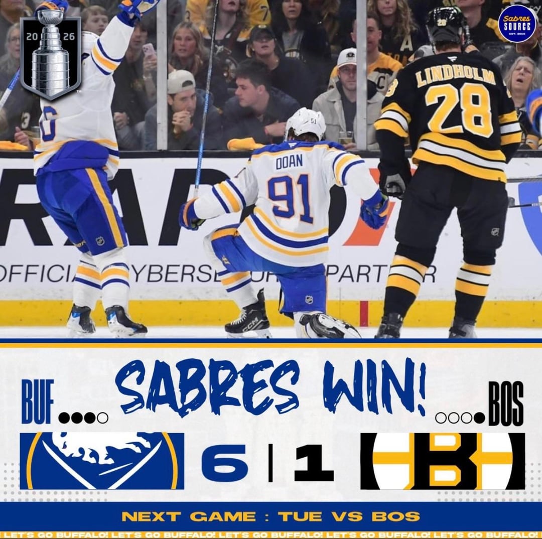Les Sabres gagnent 6-1 lors d’une déroute contre Boston pour prendre une avance de 3-1 dans la série, préparant ainsi le match de mardi soir pour avoir une chance de remporter la série pour Buffalo !