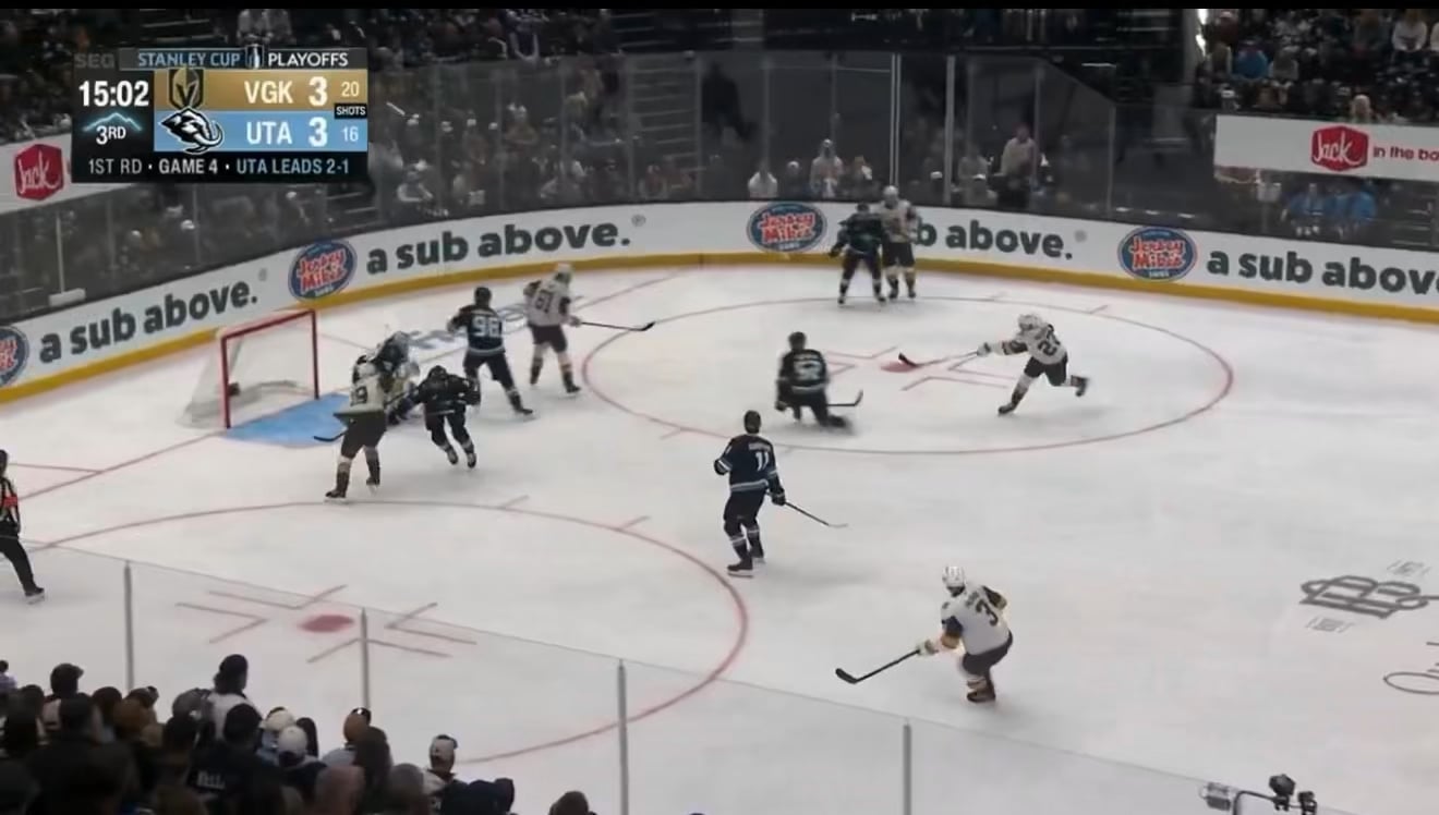 Utah gets away with a trip, play should be dead, 2 minute minor. Instead Utah gets a free goal because once again Refs don’t notice a blatant penalty.