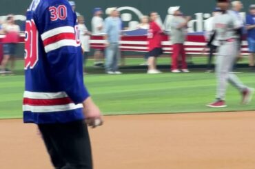 Le gardien de but des Stars de Dallas et médaillé d’or olympique Jake Oettinger lance le premier lancer de cérémonie…