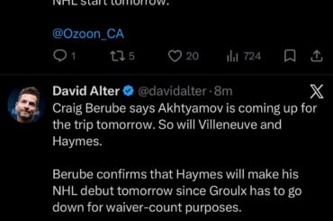 [Alter] Berube confirme qu’Akhtyamov fera son premier départ dans la LNH demain. Villeneuve et Haymes rappelés. Haymes fera ses débuts…
