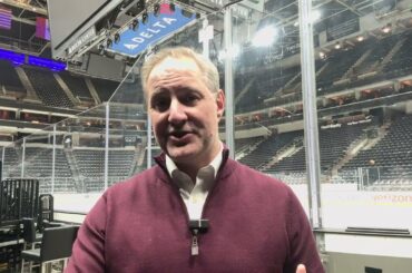 Le directeur général des Penguins de Pittsburgh, Kyle Dubas, s’assoit avec EJ Hradek et Dan Rosen lors des réunions des…