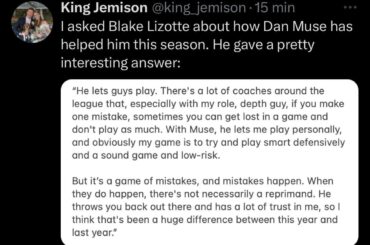 [Jemison] J’ai demandé à Blake Lizotte comment Dan Muse l’avait aidé cette saison. Il a donné une réponse assez intéressante…