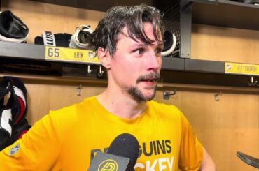 Erik Karlsson des Penguins de Pittsburgh après une défaite 6-5 contre les Sharks de San Jose. San Jose revient d’un…