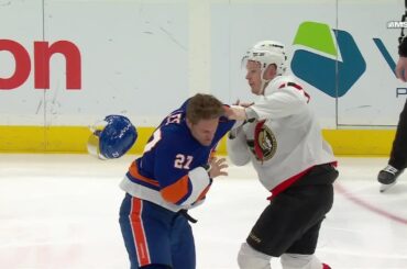 Jetez un œil à Brady Tkachuk et Anders Lee qui s’affrontent immédiatement dès la mise au jeu d’ouverture pour la…