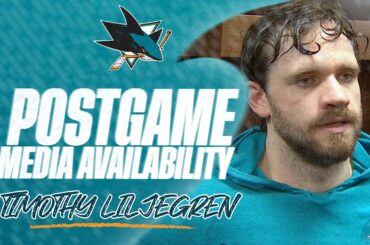 Timothy Liljegren s’adresse aux médias après la défaite 4-3 des Sharks en prolongation contre les Oilers d’Edmonton le 29 janvier…