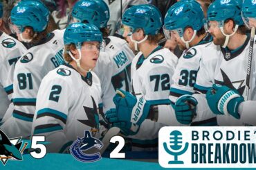 Brodie Brazil brise la victoire 5-2 des Sharks contre les Canucks de Vancouver le 27 janvier 2026.