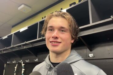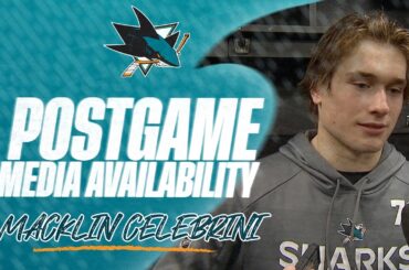 Macklin Celebrini s’adresse aux médias après la victoire 6-3 des Sharks contre les Canucks de Vancouver le 27 décembre 2025.