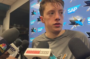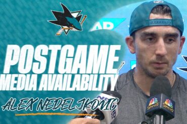 Alex Nedeljkovic s’adresse aux médias après la défaite 5-3 des Sharks contre les Stars de Dallas le 18 décembre 2025.