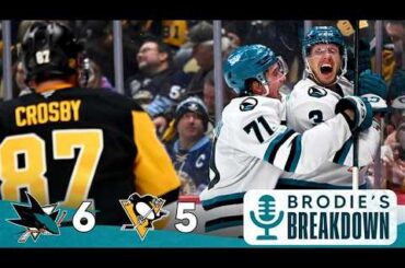 Brodie Brazil brise la victoire 6-5 des Sharks contre les Penguins de Pittsburgh le 13 décembre 2025.
