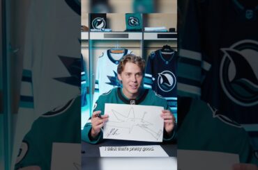 Will Smith tente de dessiner le logo des Sharks avec sa main non dominante pendant que Patrick Marleau juge la…