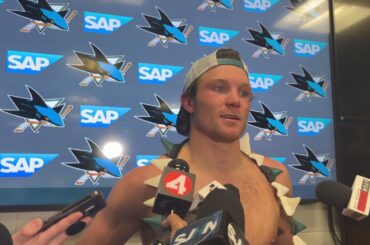 Ty Dellandrea obtient le collier du joueur du match après la victoire des Sharks 4-3 SO contre LA le 20…