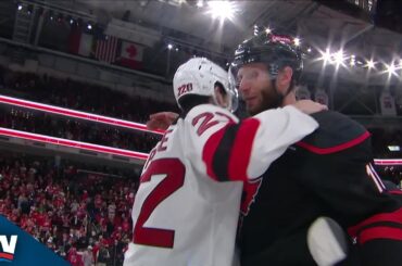 Regardez les Hurricanes de Carolina et le New Jersey Devils échangent des poignées de main après leur série de première…