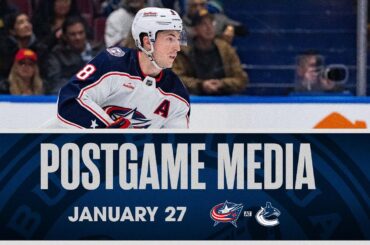 Boone Jenner, Alexandre Texier Zach Werenski et l’entraîneur-chef Pascal Vincent s’adressent aux médias après le match à Vancouver. Suivez le…