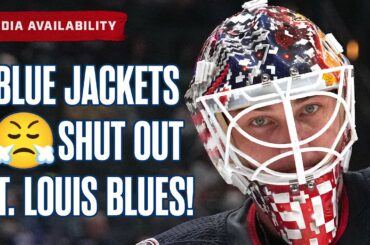 Sean Kuraly, Denton Mateychuk, Elvis Merzlikins et l’entraîneur-chef Dean Evason s’adressent aux médias après la victoire 3-0 contre les Blues.…