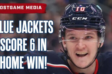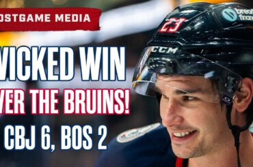 Zach Werenski, Adam Fantilli, Sean Monahan et l’entraîneur-chef Dean Evason parlent aux médias après leur victoire 6-2 contre les Bruins…