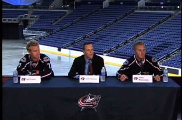 Les nouveaux acquis Jeff Carter et James Wisniewski sont présentés aux médias de Columbus par le directeur général Scott Howson…