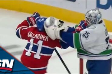 Regardez l’attaquant des Canadiens de Montréal Brendan Gallagher percuter le filet des Canucks de Vancouver, entrer en contact avec le…