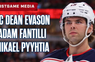 L’entraîneur-chef Dean Evason, Adam Fantilli et Mikael Pyyhtia s’adressent aux médias après le match à Tampa. Suivez le #CBJ sur…