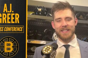 BOSTON, MA – Les Bruins AJ Greer ont parlé aux journalistes après la victoire 6-3 des Bruins lors de leur…