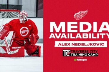 Alex Nedeljkovic s’entretient avec les médias lors de la première journée du camp d’entraînement des Red Wings de Detroit au…