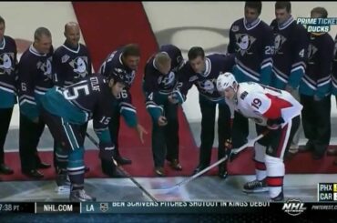 soirée rétro à Anaheim alors qu’ils utilisent leurs maillots vintage des Mighty Ducks d’Anaheim sur la glace alors qu’ils patinent…