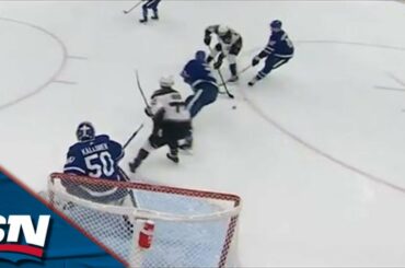 Juuse Saros sort pour jouer la rondelle mais son ancien coéquipier Eeli Tolvanen lit son jeu, intercepte la passe et…