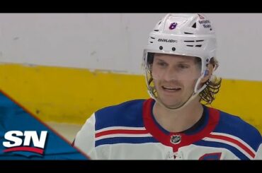 Regardez le capitaine des Rangers de New York Jacob Trouba lancer une passe pour marquer et demander à Andreas Athanasiou…