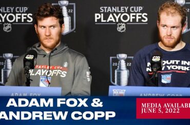Le défenseur des Rangers de New York Adam Fox et l’attaquant Andrew Copp répondent aux questions des médias après le…