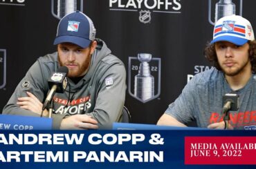 Les attaquants des Rangers de New York Andrew Copp et Artemi Panarin répondent aux questions des médias après le match…