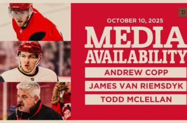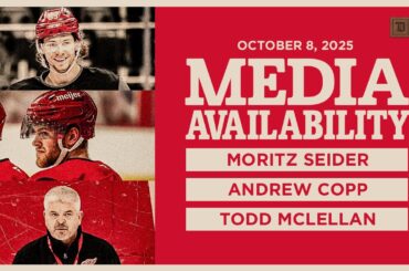 Moritz Seider, Andrew Copp et Todd McLellan s’entretiennent avec les médias après l’entraînement de Detroit le mercredi 8 octobre 2025…