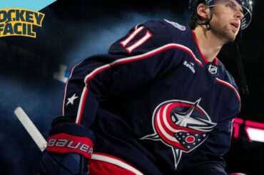L’attaquant des Blue Jackets de Columbus Cole Sillinger intercepte une passe et joue à l’écart en zone neutre contre les…