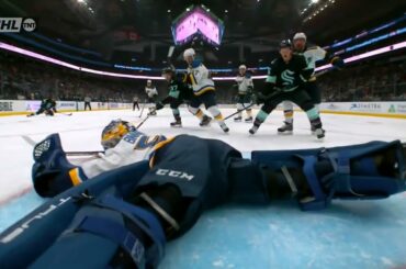 Le gardien de but de Seattle, Martin Jones, nie Sidney Crosby de près pour garder le Kraken en tête 2-1…