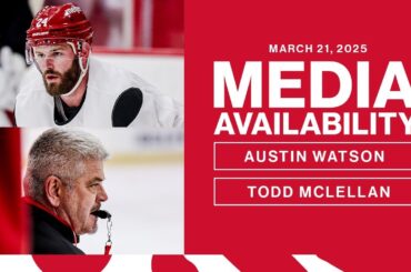 Austin Watson et Todd McLellan parlent avec les médias après l’entraînement de Détroit le vendredi 21 mars 2025 au Belfor…