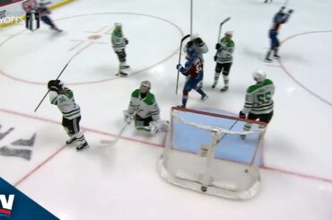 Regardez les étoiles essayer de nettoyer la rondelle après la sauvegarde de Jake Oettinger, mais elle rebondit au large de…