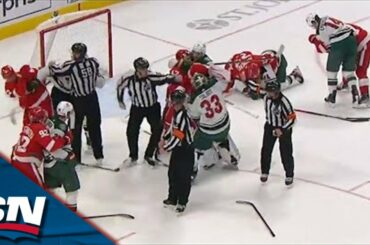Regardez une bagarre complète éclater à la fin de la deuxième période entre les Red Wings de Detroit et le…