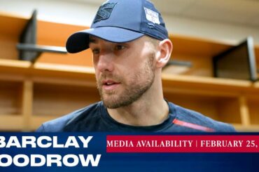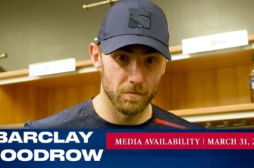 L’attaquant des Rangers de New York Barclay Goodrow répond aux questions des médias après le match du 31 mars contre…