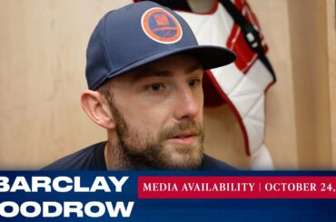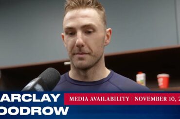 L’attaquant des Rangers de New York Barclay Goodrow répond aux questions des médias après le match du 10 novembre contre…