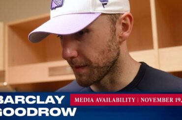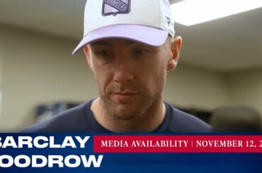 L’attaquant des Rangers de New York Barclay Goodrow répond aux questions des médias après le match du 19 novembre contre…