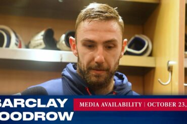 L’attaquant des Rangers de New York Barclay Goodrow répond aux questions des médias après le match du 23 octobre contre…