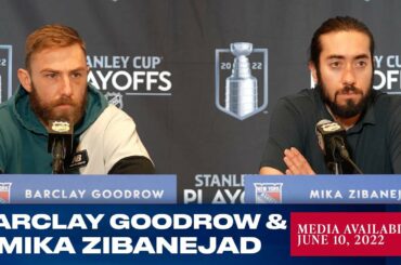 Les attaquants des Rangers de New York Barclay Goodrow et Mika Zibanejad répondent aux questions des médias après l’entraînement du…