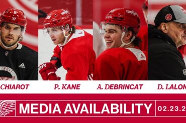 Ben Chiarot, Patrick Kane, Alex DeBrincat et Derek Lalonde parlent avec les médias après l’entraînement de Détroit le vendredi 23…