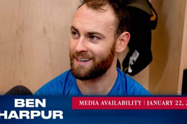 Le défenseur des Rangers de New York Ben Harpur répond aux questions des médias après l’entraînement du 22 janvier. »…
