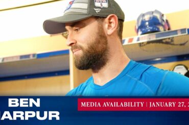 Le défenseur des Rangers de New York Ben Harpur répond aux questions des médias avant le match du 27 janvier…