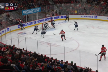 Regardez la recrue des Blackhawks de Chicago, Anton Frondell, traquer une rondelle qui se fait couper devant le gardien de…