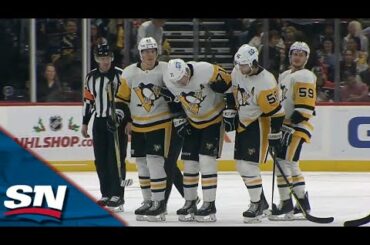 Regardez alors que l’attaquant des Penguins de Pittsburgh Evgeni Malkin doit quitter le match après que le tir frappé de…
