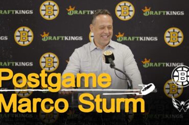 L’entraîneur-chef Marco Sturm parle avec les médias après une victoire de 3-1 contre les Capitals au TD Garden.